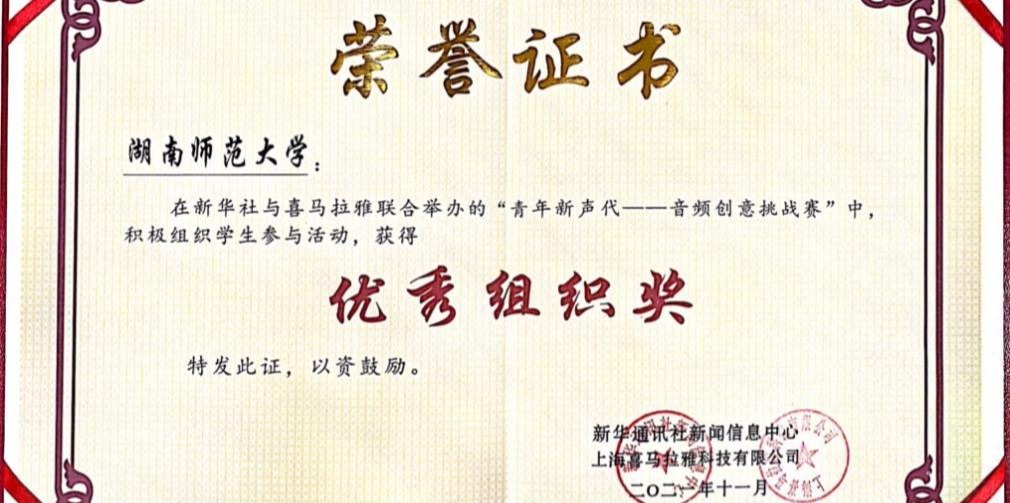 在新华社、喜马拉雅联合举办的“青年新声代——音频创意挑战赛”中,我校积极组织发动学生参赛,参赛学生及作品数量居全省高校第一,荣获优秀组织奖。