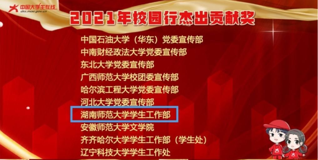 在教育部中国大学生在线2021年度表彰中,我校师生及作品共获评10项荣誉。在2021年度校网通表彰中,我校荣获“全国优秀校园网络通讯站”,《青春告白祖国|我和我的祖国,我最亲爱的祖国》作品入选年度影响力内容奖项(音频类),新闻与传播学院学生赵一奇获评优秀校园媒体人;在2021年度校园行活动表彰中,我校荣获2021年校园行突出贡献奖与优秀组织奖;在2021年度校园新媒体表彰中,我校入选校园新媒体互动百强,工程与设计学院辅导员张杜豆获评2021年度校园新媒体优秀指导教师,文学院学生杨柳被评为2021年度校园新媒体卓越学生编辑。